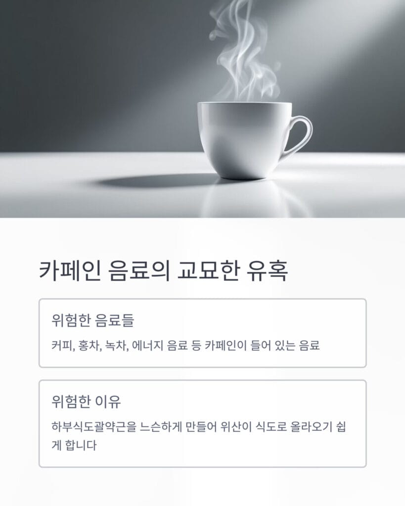 커피, 홍차, 녹차, 에너지 음료 등 카페인이 들어 있는 음료는 하부식도괄약근을 느슨하게 만들어 위산이 식도로 올라오기 쉽게 합니다. 하루 한두 잔이라도 증상을 악화시킬 수 있어 주의가 필요합니다.