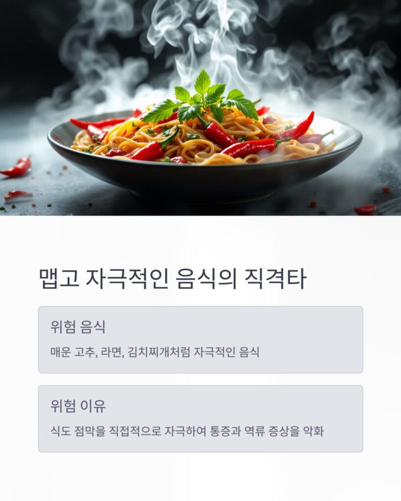 매운 고추, 라면, 김치찌개처럼 자극적인 음식은 식도 점막을 직접적으로 자극하여 통증과 역류 증상을 악화시킵니다. 잠깐의 맛은 즐거워도 속은 고생할 수밖에 없습니다.