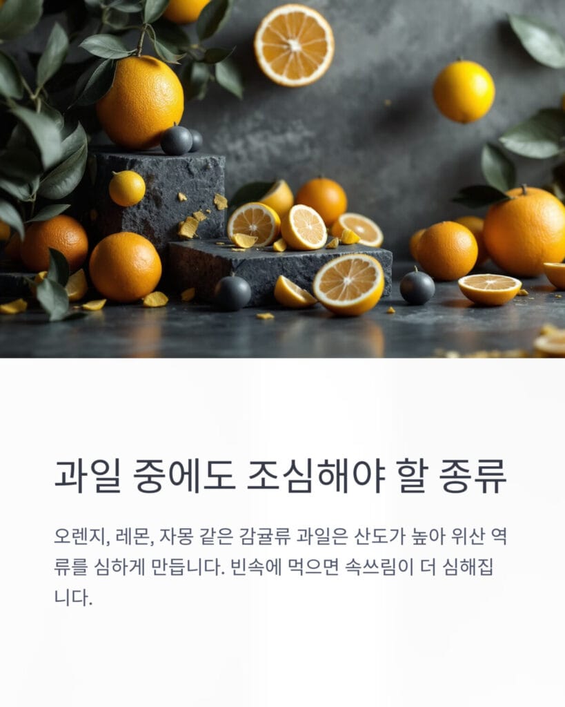 오렌지, 레몬, 자몽 같은 감귤류 과일은 산도가 높아 위산 역류를 심하게 만듭니다. 빈속에 먹으면 속쓰림이 더 심해질 수 있으니 특히 피하는 게 좋습니다.