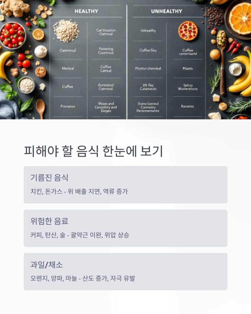 | 기름진 음식 | 치킨, 돈가스 | 위 배출 지연, 역류 증가 |
