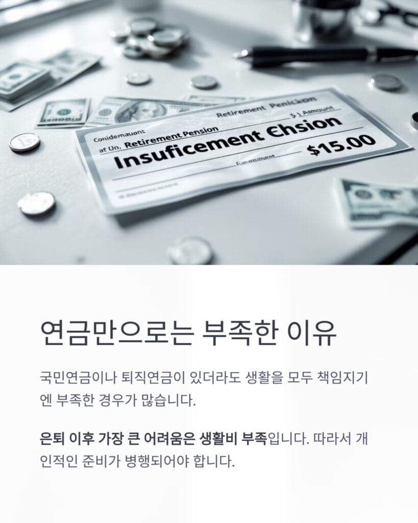 국민연금이나 퇴직연금이 있더라도 생활을 모두 책임지기엔 부족한 경우가 많습니다. 실제로 은퇴 이후 연금만으로 생활하는 이들이 겪는 가장 큰 어려움은 생활비 부족입니다. 따라서 개인적인 준비가 병행되어야 합니다.