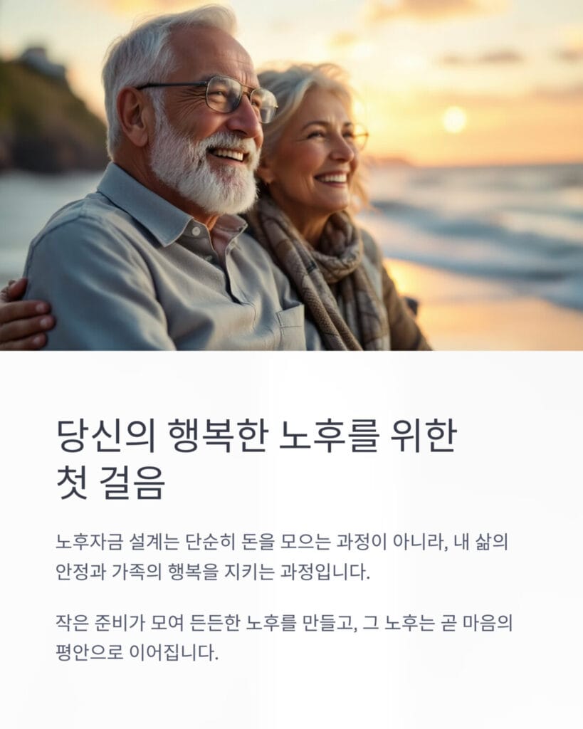 작은 준비가 모여 든든한 노후를 만들고, 그 노후는 곧 마음의 평안으로 이어집니다. 더 이상 미루지 말고 지금 이 순간부터 내 삶의 미래를 직접 설계해 보시길 바랍니다.